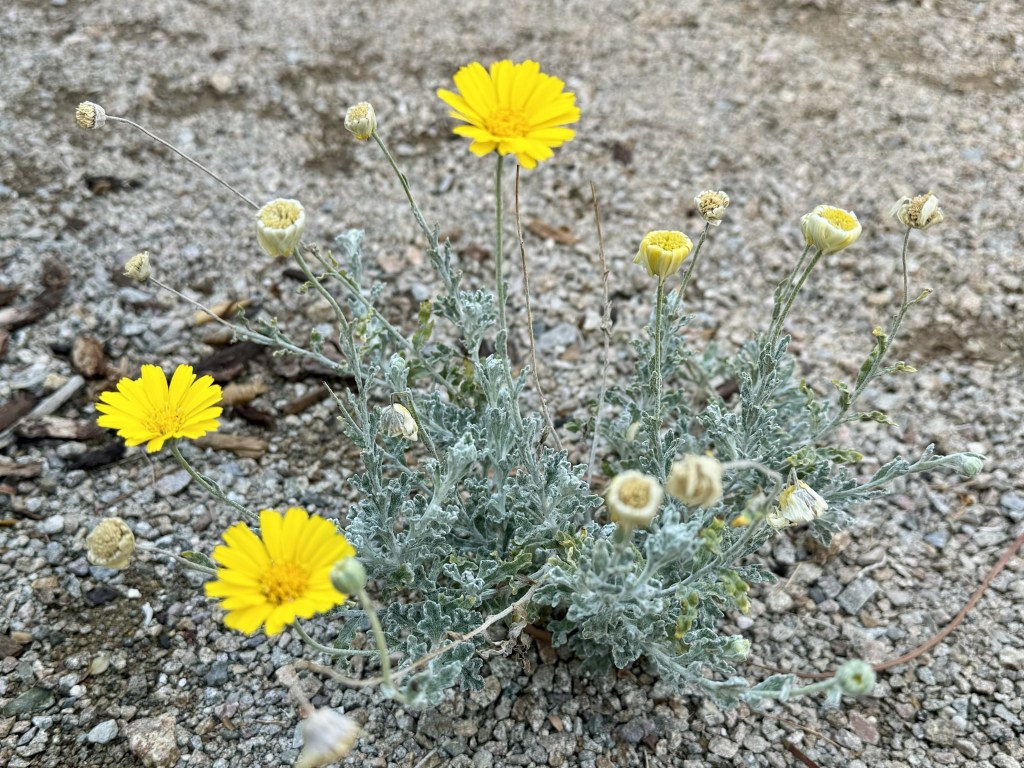 Desert marigold flowers off-and-on throughout the hottest parts of summer. In spring, they produce larger, double-flowered blooms, about the same time that prickly pear and brittlebush and hedgehog cactus are blooming. They bloom prolifically in fall, though the flowers are smaller.