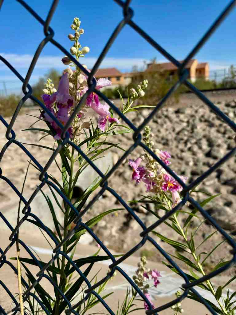 It is an adolescent desert willow (Chilopsis linearis). It is arrogant. Surviving there, in those conditions. Blooming now, after months of unabated heat. The monsoons did not come to our neighborhood.