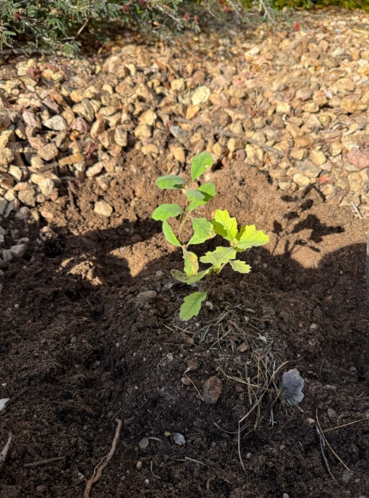 It was with great anticipation that I decided to plant the blue oak seedling (Quercus douglasii) I picked up from the Springs Preserve plant sale earlier this fall when the temperatures were still too hot to plant. I had intended to baby it all winter but it has been so mild I decided to plant it in the front garden behind a large rock and between two Baja fairy dusters (Calliandra californica) that will be its nurse plants during the hot summer, protecting it from scorching sun.