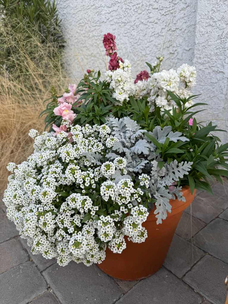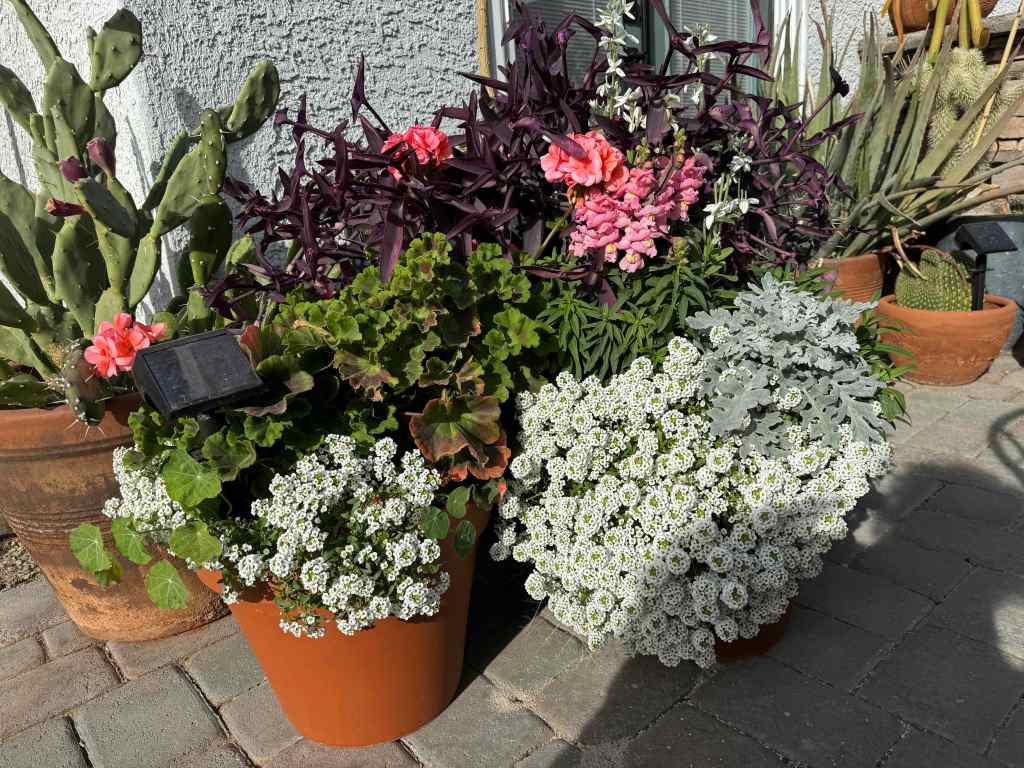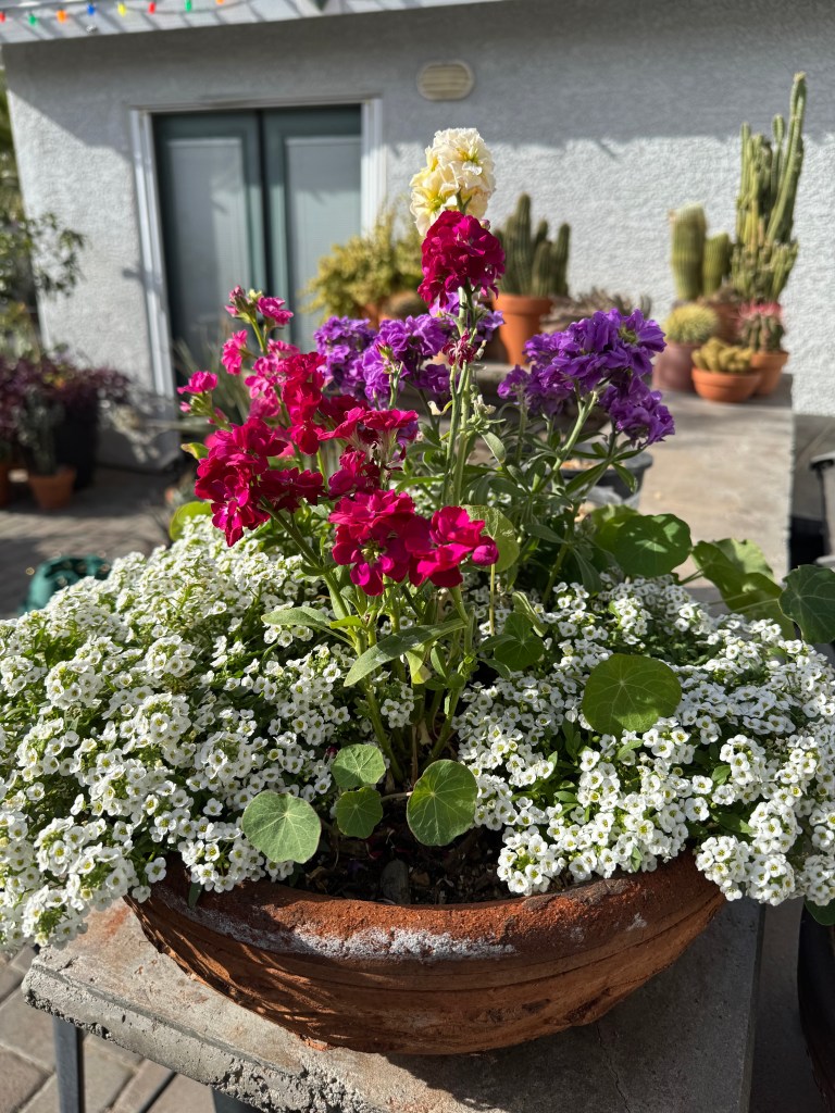 The annuals in containers are in paradise and the courtyard smells like clove and honey. They need water every five to seven days right now. Some winters I can get away with watering every 10 to 14 days, but not this year. I got nasturtium in late, but all their little lily pad-shaped leaves are growing bigger in the sun and warmth—they will need to be covered if a hard frost comes, though in the protected courtyard hard frosts are rare.